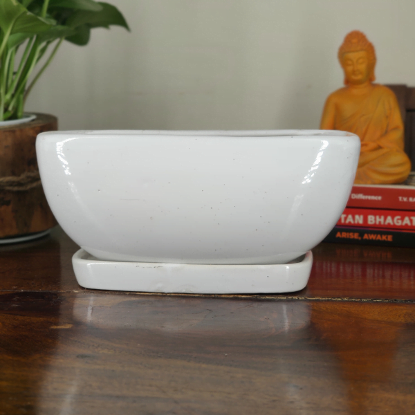 This classic ceramic bonsai pot bears an eye-catching rectangular shape and a lustrous glaze. This not only provides your plant with suitable growing conditions but also lends a stylish and charming vibe to any space indoors.